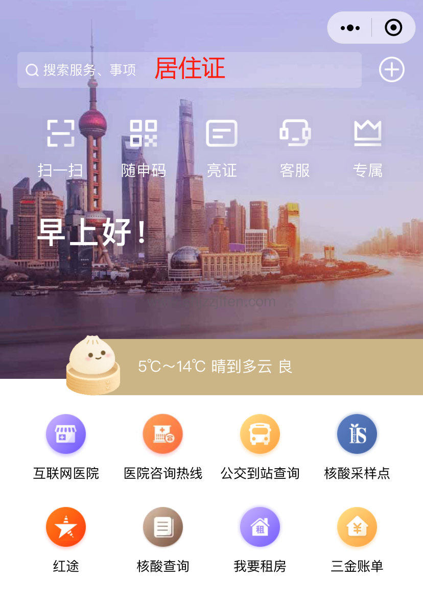 1.打开随申办app或微信/支付宝小程序,在首页搜索“居住证”,并点击“居住证新办”;