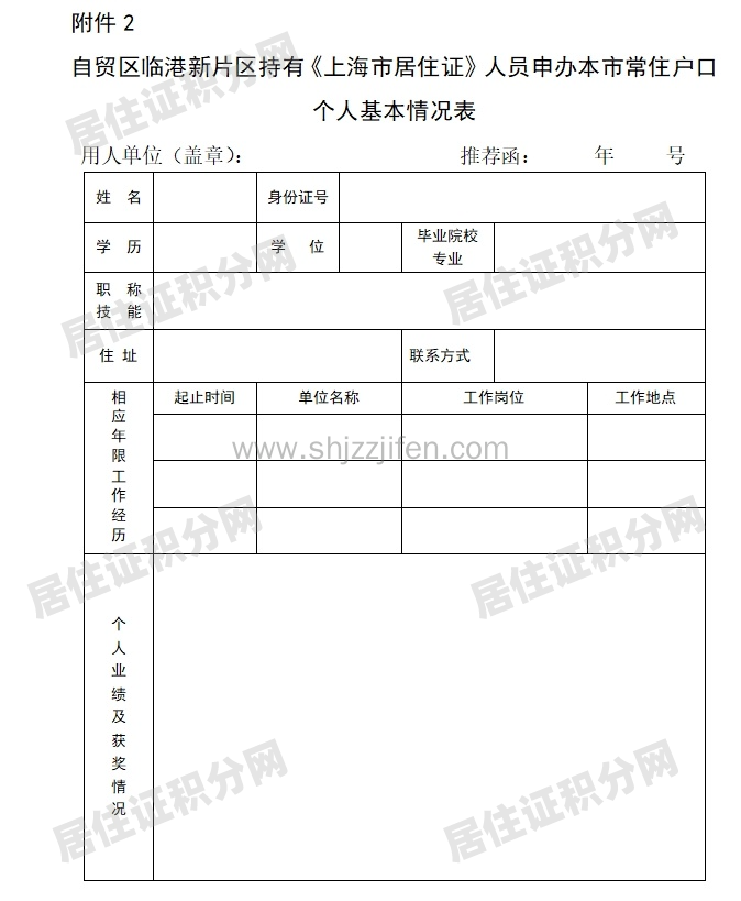 2.自贸区临港新片区持有《上海市居住证》人员申办本市常住户口个人基本情况表;