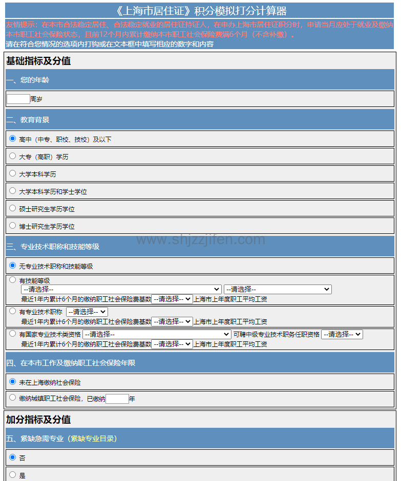 上海积分计算入口>>>>点击上海居住证积分模拟打分计算器(30s快速查询)