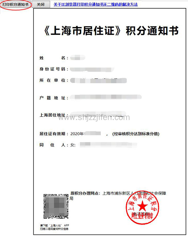 《上海市居住证》积分申请表(网上打印后盖公章签字)
