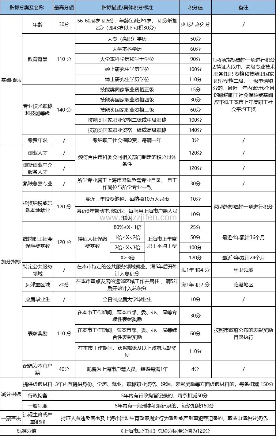 * 最新《上海市居住证积分管理办法》120积分分值表*