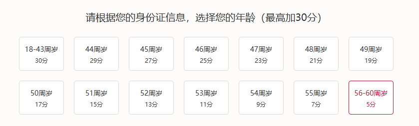 持证人年龄在56-60周岁,积5分;年龄每减少1岁,积分增加2分。