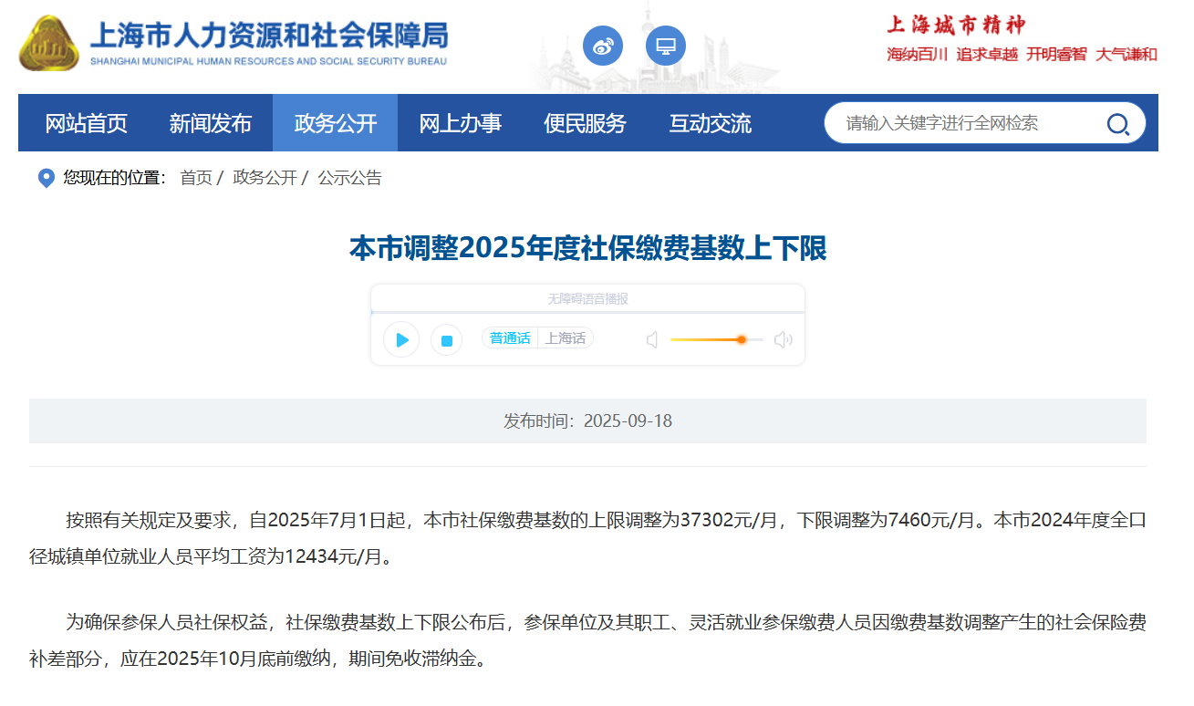 2025年9月18日,上海人力资源和社会保障局最新发布:按照有关规定及要求,自2025年7月1日起,本市社保缴费基数的上限调整为37302元/月,下限调整为7460元/月。本市2024年度全口径城镇单位就业人员平均工资为12434元/月。