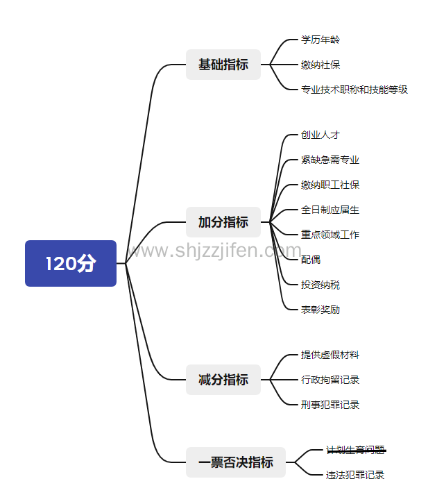 加分指标:创业人才、创新创业中介服务人才、紧缺急需专业、投资纳税或带动本地就业、缴纳职工社会保险费基数、特定的公共服务领域、远郊重点区域、全日制应届毕业生、表彰奖励、配偶为本市户籍人员等指标。