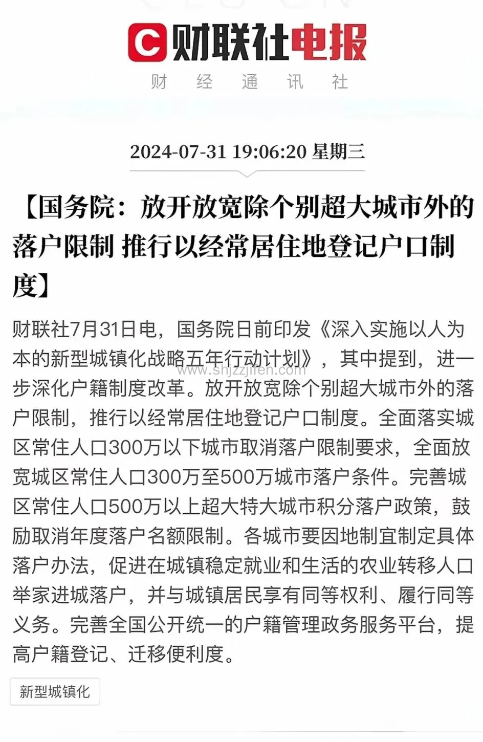 7月31日,国务院发布了《深入实施以人为本的新型城镇化战略五年行动计划》的通知,其中强调了户籍制度的进一步改革和随迁子女教育权利的保障等关键任务。