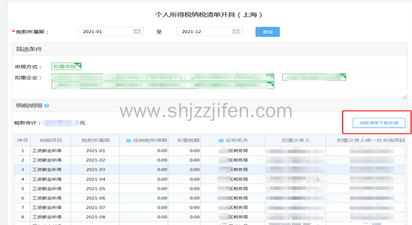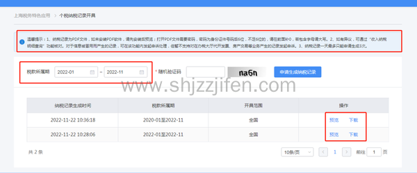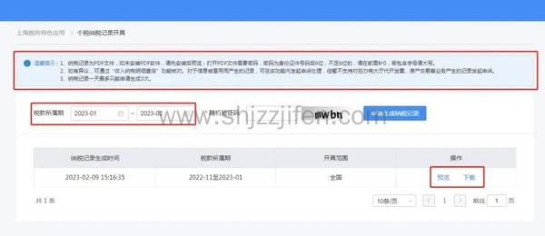 2、在个人纳税记录开具页面,选择相应的纳税所属期,点击申请生成纳税记录并下载。