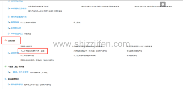 3、登录后,选择“证明开具”,然后点击“个人所得税纳税清单开具(上海)”。