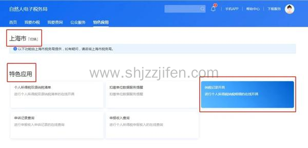 1.登录自然人税务局官网,选择城市“上海”,然后进入“特色应用”中的“纳税记录开具”。