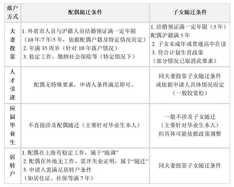 配偶条件: 若配偶劳动关系不在上海,需提供身份证、户口本、无业证明(失业登记证) ;若配偶劳动关系在上海,需档案同步调入,审核学历、职称、社保等材料 。