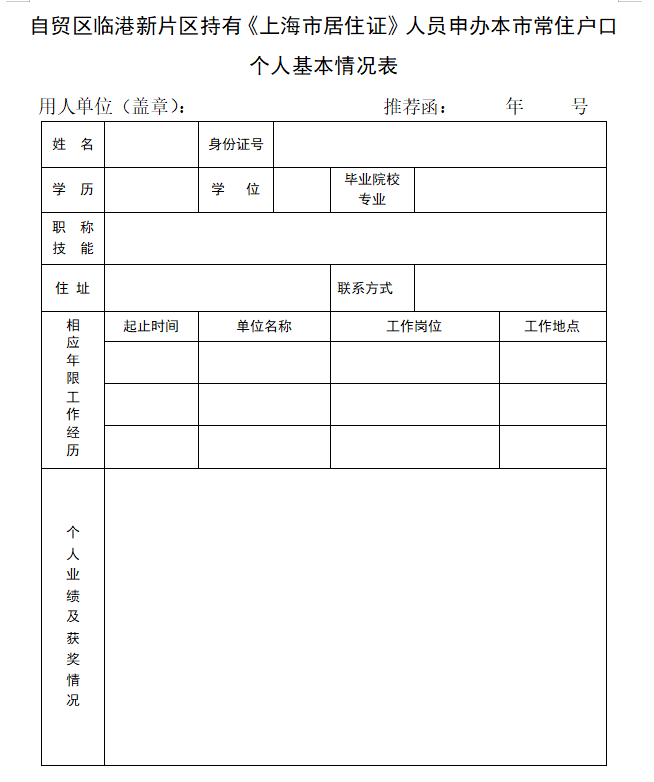 2. 自贸区临港新片区持有《上海市居住证》人员申办本市常住户口个人基本情况表;